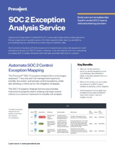 Der Prevalent SOC 2® Exception Analysis Service ist ein verwalteter Service, der vom Risk Operations Center (ROC) bereitgestellt wird und SOC 2-Berichtskontrollausnahmen in Risiken in der Prevalent Third-Party Risk Management Platform umwandelt.