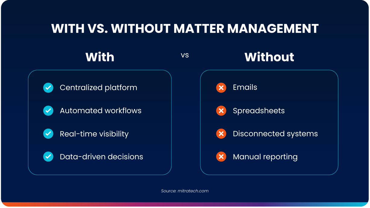 Matter management software enables legal teams to move from disconnected processes to a centralized, efficient, and data-driven operating model.